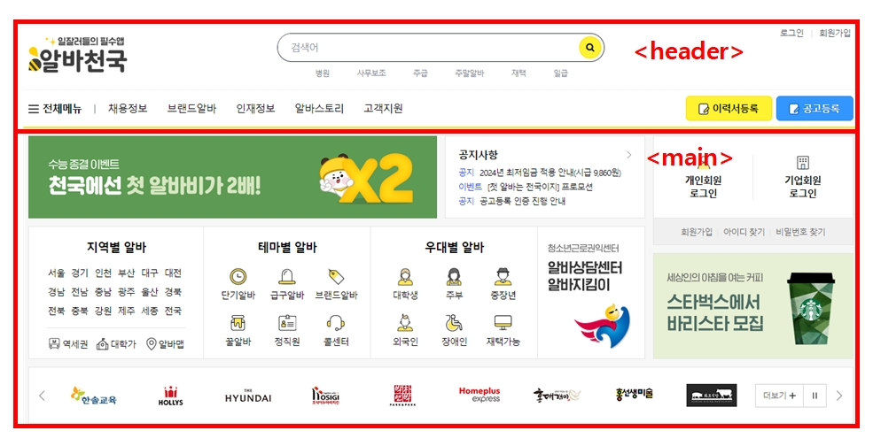 알바천국 메인 페이지 상단 부분을 참고한 후, 디자인할 부분을 빨간 박스로 표시했습니다. 저는 이를 <header> 와 <main>으로 구분하여서 레이아웃을 배치하려고 하며, 표시하지 않은 나머지 부분도 레이아웃을 구조화하여서 한글에서 작업을 진행했습니다.